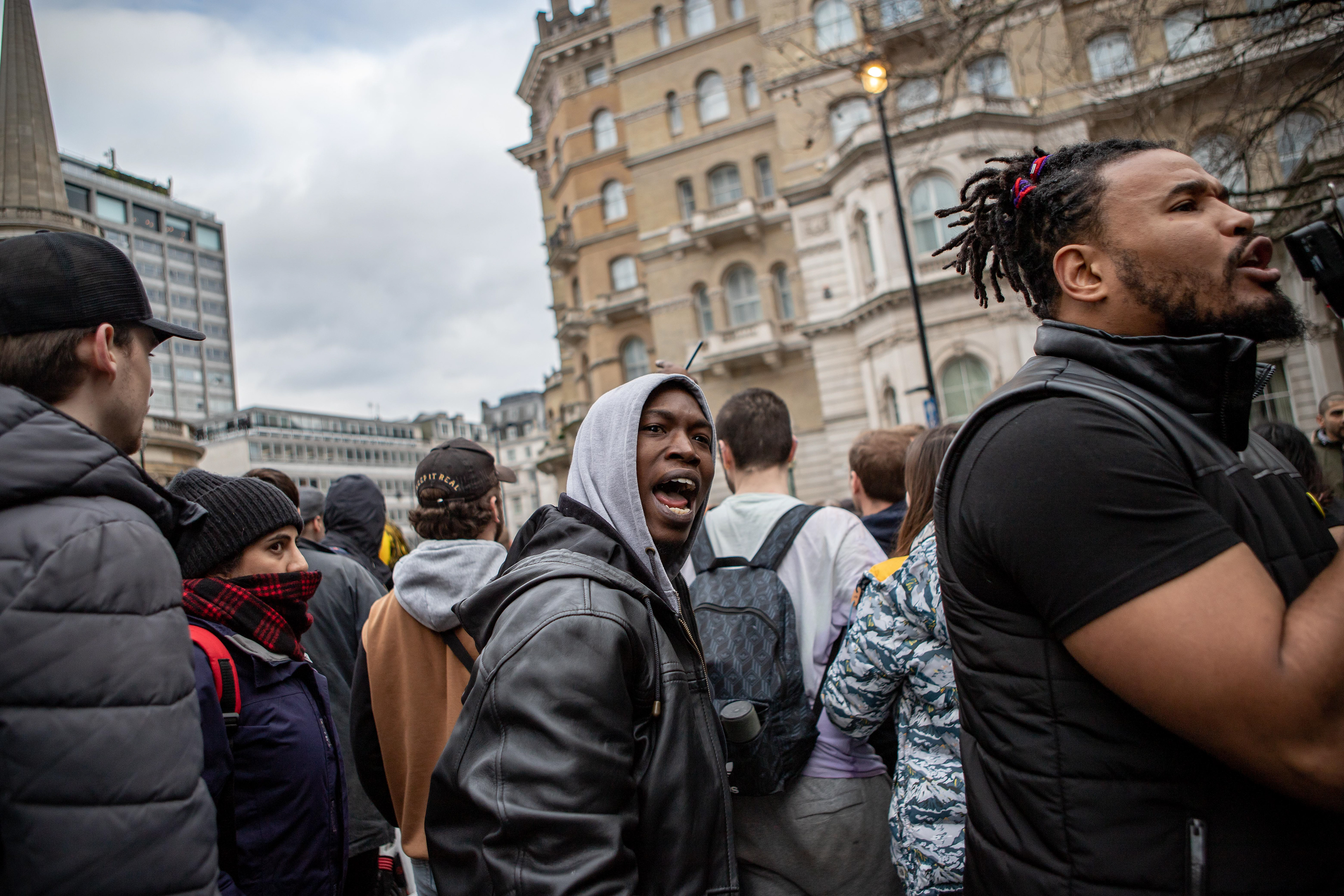 The majority of protesters dispersed however a small group were chased back towards Trafalgar Square with a few at the tail end being caught and arrested. Demonstrators threw glass bottles at police as they fled.