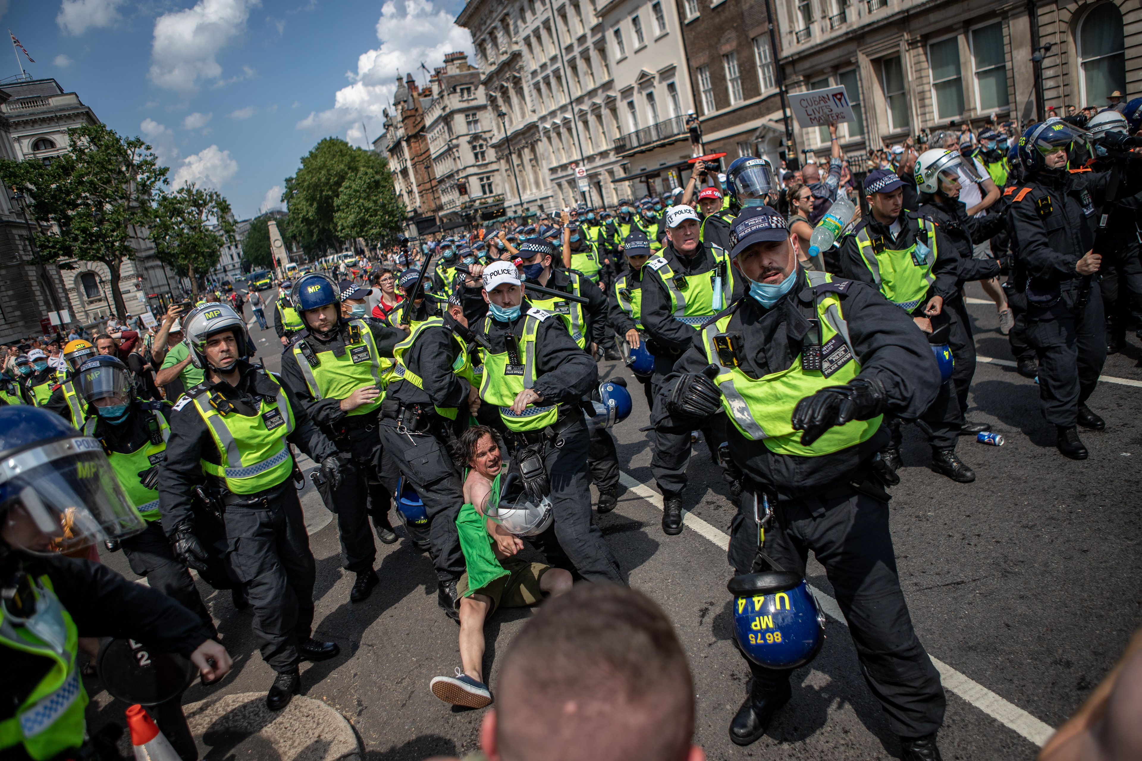LONDON - On the day all remaining Covid restrictions are lifted across England, thousands gather in and around Parliament Square to protest against Covid vaccinations, passports and other restrictions surrounding Covid19. Clashes erupted as police moved in to try and disperse the crowd.